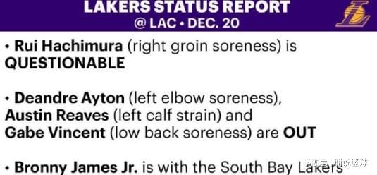 赛季第二次洛杉矶德比,官方也是更新了伤病报告,湖人三将继续休战,包括里夫斯、艾顿和文森特。此外八村塁出战成疑,布朗尼则被下放到发展联盟,看来攻防节奏加快,对于球员身体也是考验,这几年伤病情况明显更多了。